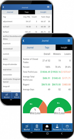 The Journal is found under the “More” Tab which maximizes the features and functionality as found on the desktop version. Click on the Menu Bar (upper right corner)to select Account. You can also filter by specific Symbols, Tags or Date Range.