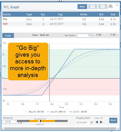 For deeper Trade Analysis, use the Volatility Slider tool and the Date Picker, located at the bottom of the P&L Graph: