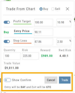 When trading from the Chart (OCO orders), you can elect to Show Confirmation – or not.