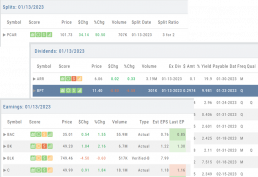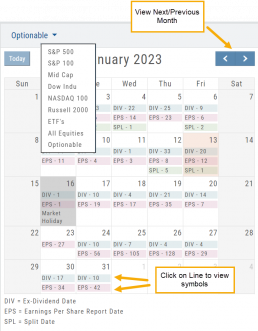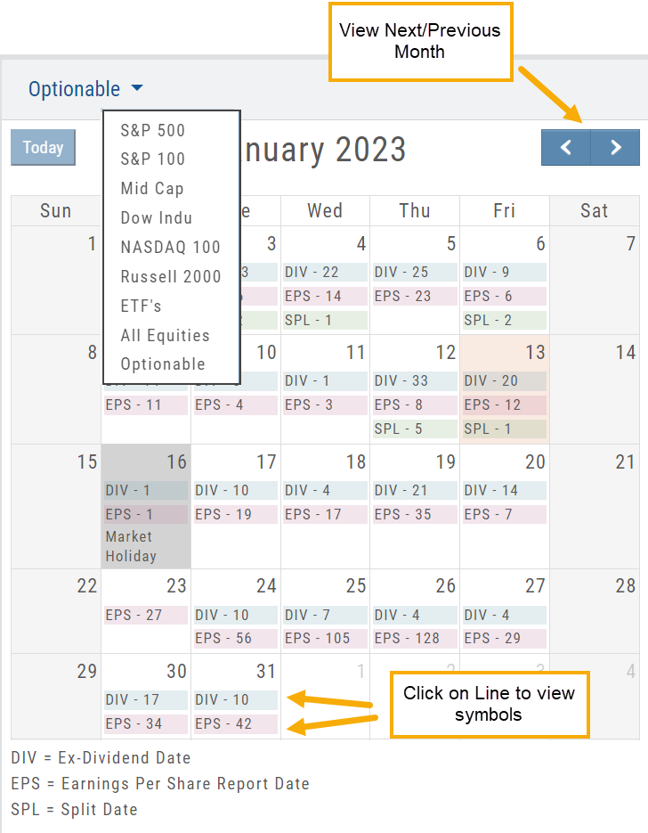 Select “DIV”, “EPS”, “SPL” by calendar date. Use the drop-down menu on the upper left corner to select S & P 500 stocks, All Equities, Optionable, etc.
