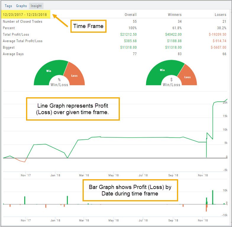 The Insight Tab, along with Tags and Graphs update dynamically with the account(s), symbol(s), tag(s) and/or date range selected.