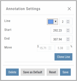 Clicking on any Trend Line, Note, or Advanced Annotation, will display the “Annotation Settings” box for that entry.