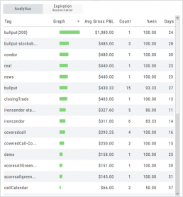 Get visual feedback broken down by strategies and analytical data including a Profit Graph, Average Gross P&L, the frequency of each strategy executed, % Win Ratio, Number of Days in a Trade.