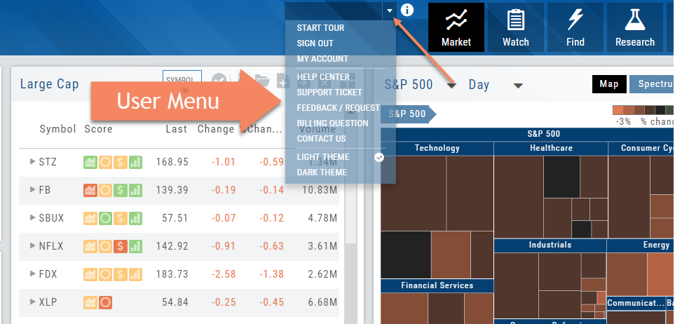 The User Menu is one of the 6-point Navigation system of this trading platform. You can access The Help Center from here, ask a support question, check your account, suggest a feature idea or provide feedback on the platform, even change the platform ‘theme’ (example “light” or “dark”) and more.