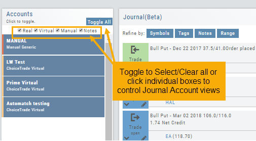 You can further sort by Symbol, Tags, Notes or Date Range within an Account by using the following tabs in the Journal: