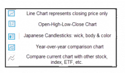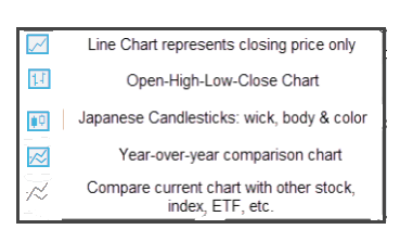 You have the flexibility in not only the way the data is displayed, but you also have choices in comparisons: Year-over-Year comparisons of your current Stock, up to a 5-year period. You can also compare your current stock to another stock, another index, ETF, etc.