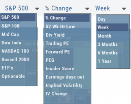 Drop-down menus allow you to select Index, Time Frame and various Data Points. Choose among % Change, Dividend Yield, PEG, 52 week High-Low and more.