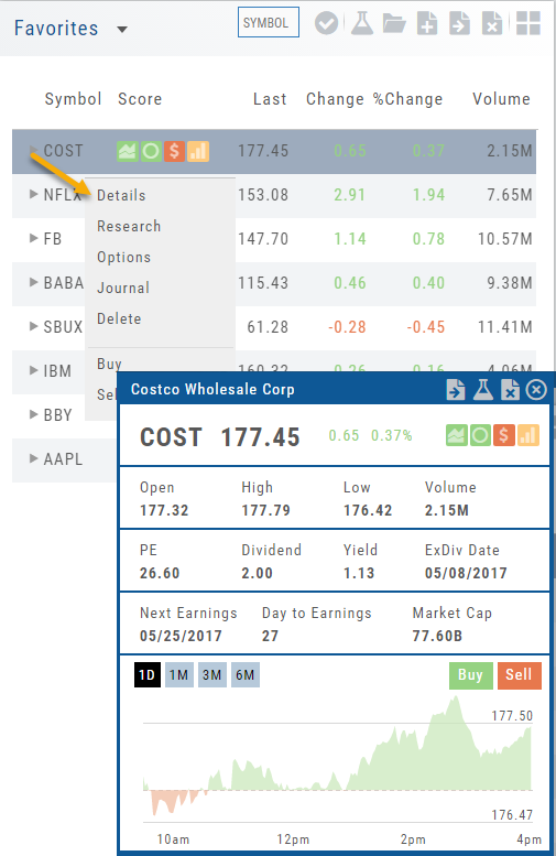 The Action Arrow Icon will provide a pop-up Quote Detail window including the current price, trading volume, Dividend Date -if applicable, Earnings Date and more. A chart, on the bottom part of the Detail Box, allows for difference periodices: 1 Day, 1,3 or 6 Months.