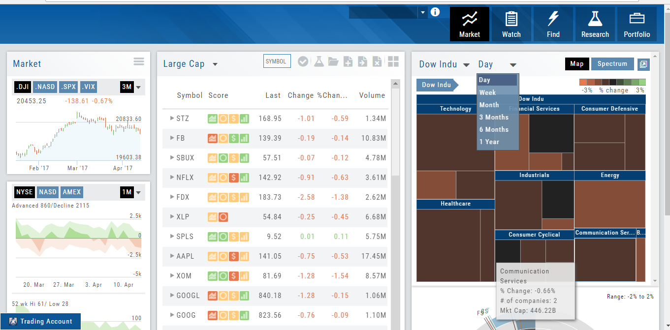 Designed to show what the overall markets are doing by viewing the graphs, charts and maps. You can change the time frame to check trends, use the maps on the right side of the page for a picture of sectors in relation to the market. Even drill down to industry within the sector and more.
