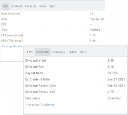 Dividend Tab: Get Yield, Amount, Payout Ratio (dividend/EPS), the Ex-Dividend Date (deadline to complete a stock purchase to be entitled to dividends), Payout information, Frequency and link to the prior 12 Quarter Dividends.