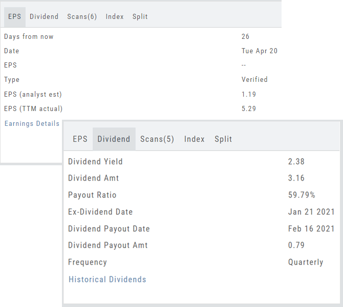 Earnings Tab: Get Earnings date, number of business days until announcement, Estimated and Actual Trailing Twelve Months (TTM) EPS, and link to the prior 12 Quarter Earnings details.