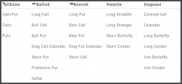 A Strategy Template provides a shortcut to quickly create an option strategy, virtually eliminating structure errors. Once selected, you can modify the structure within the template using the tools on above the option tables: Moving Strikes up/down, rolling Time out/in, widening or narrowing Strikes.