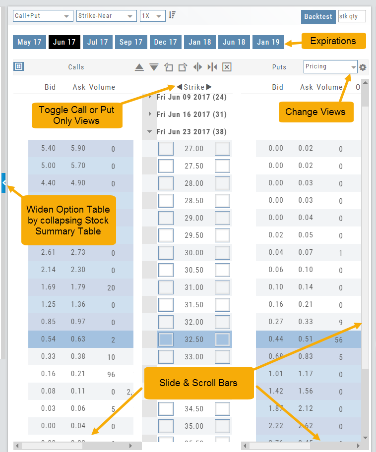 The Option Chain Expiration Table gives you control of selecting which Expiration Cycle(s) you want to view.