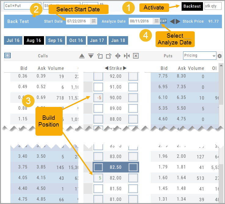 - From the Calls+Puts chain (as well as “Calls” or “Puts”) enter the initial trade position.