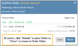 The Close Ticket provides a summary of any Profit/Loss on the trade. Brokerages determine available Order Types, which may include the following to open a trade: