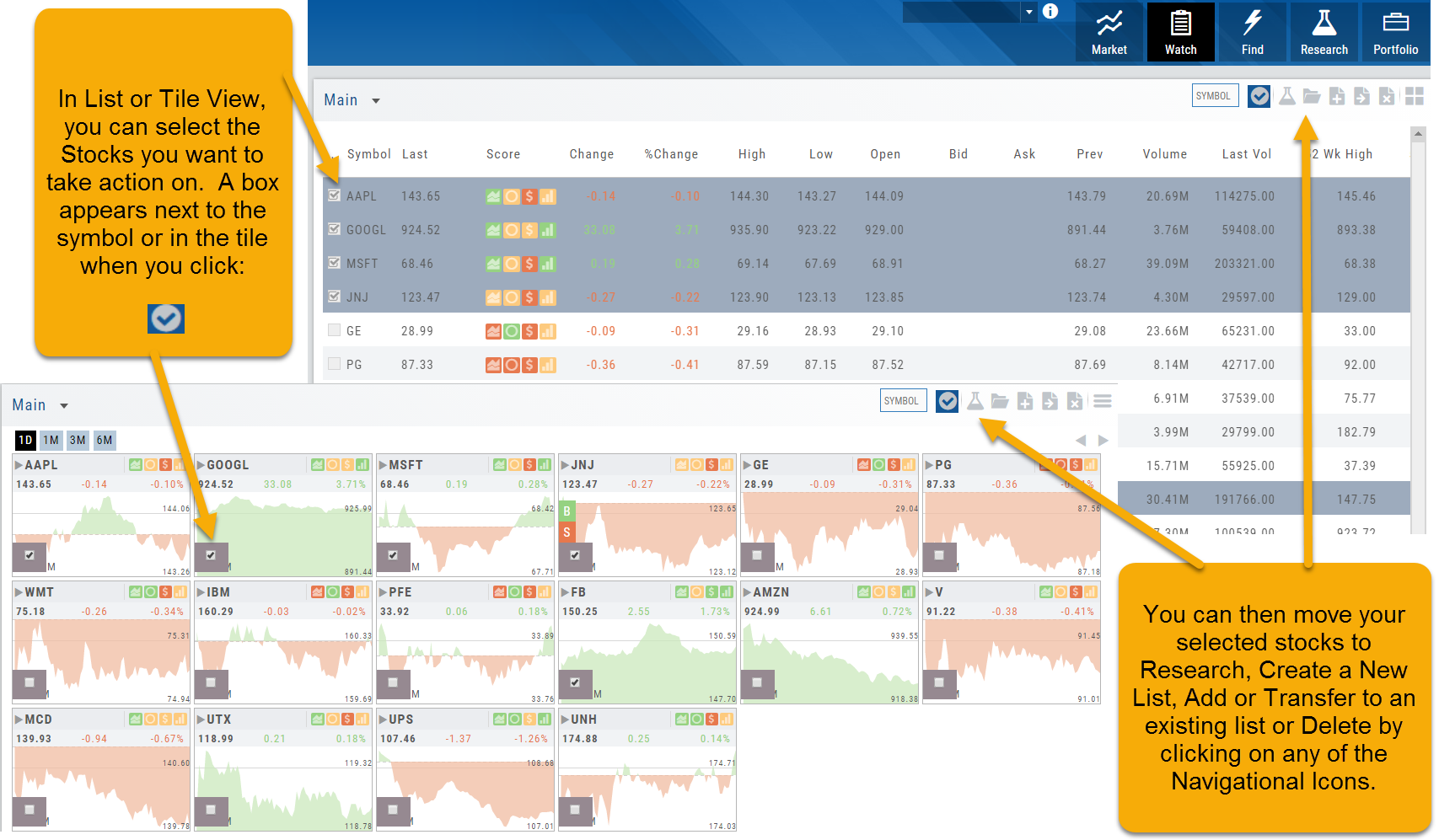 Both Tile and List View a ‘bird’s eye view’ of the stock, can be moved to the Reseach Tab, added, transferred or deleted from a Watchlist.